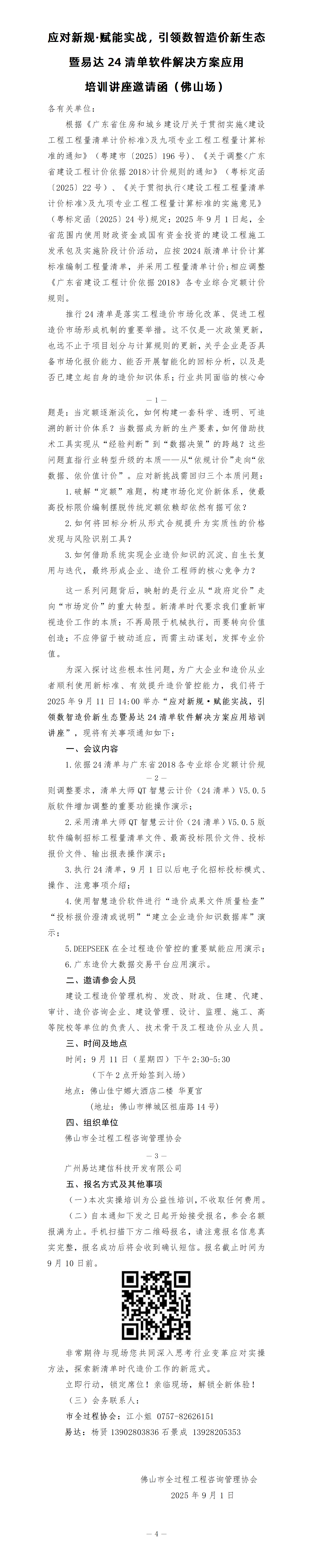 诚邀您参加9月11日下午2:30-5:30在佛山佳宁娜大酒店举办《应对新规·赋能实战,引领数智造价生态暨易达24清单软件解决方案应用培训讲座(佛山场)》,聚焦24清单与省2018综合定额计价规则调整、清单大师QT智慧云计价(24清单)版软件调整功能操作演示、9月1日以后电子化招标投标模式及造价文件编制、文件质量检查、清标回标分析、造价数据库建立、AI数智技术全过程应用、造价大数据交易,报名链接:https://www.wjx.cn/vm/hnz2OjV.aspx# ,欢迎参加!